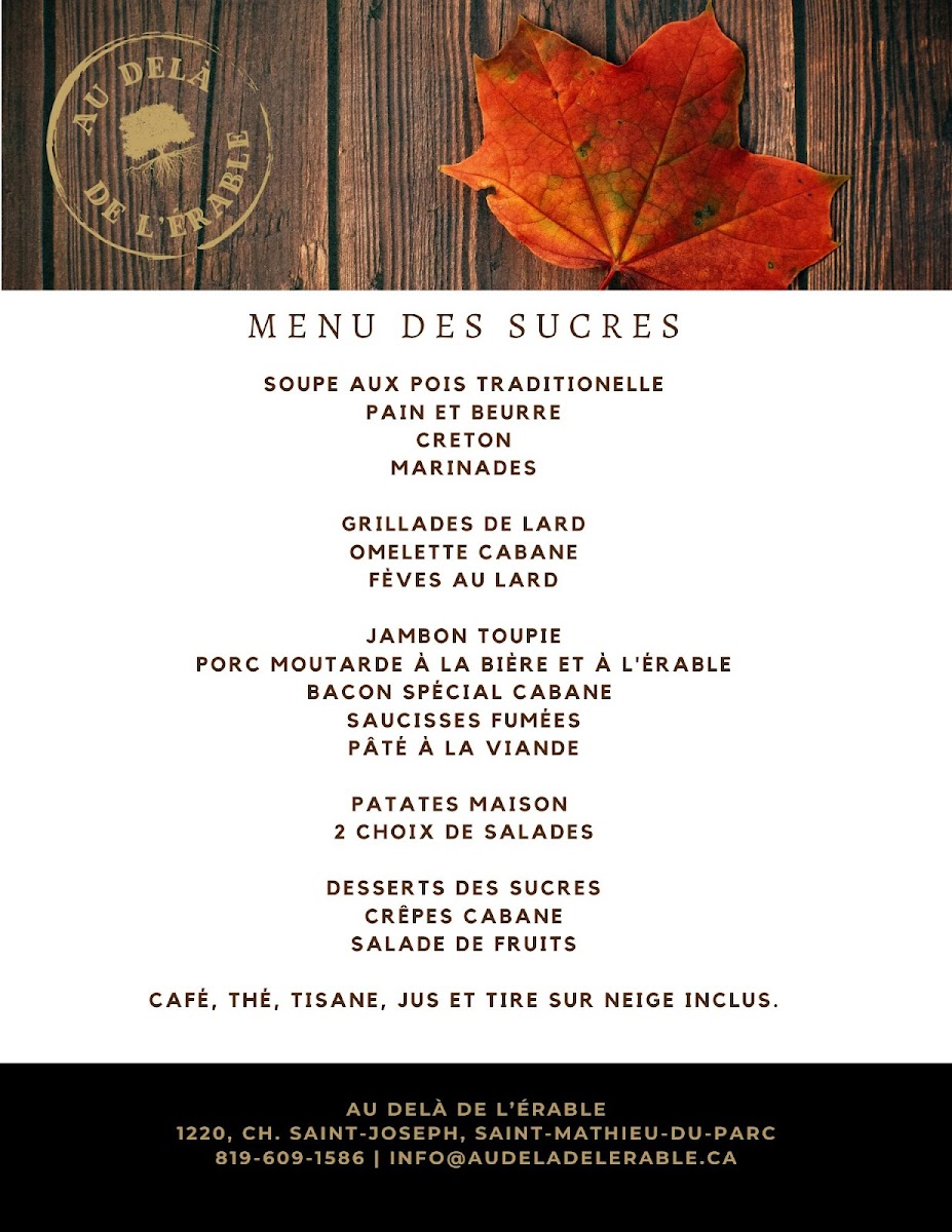 Welcome to Au Delà de l'Érable, an enchanting culinary haven located in the serene landscapes of Saint-Mathieu-du-Parc, Quebec. This delightful establishment offers an all-you-can-eat buffet experience, where the warmth of a traditional sugar shack meets modern flair. Diners are treated to a diverse menu featuring both hot and cold options, crafted with love and quality ingredients.